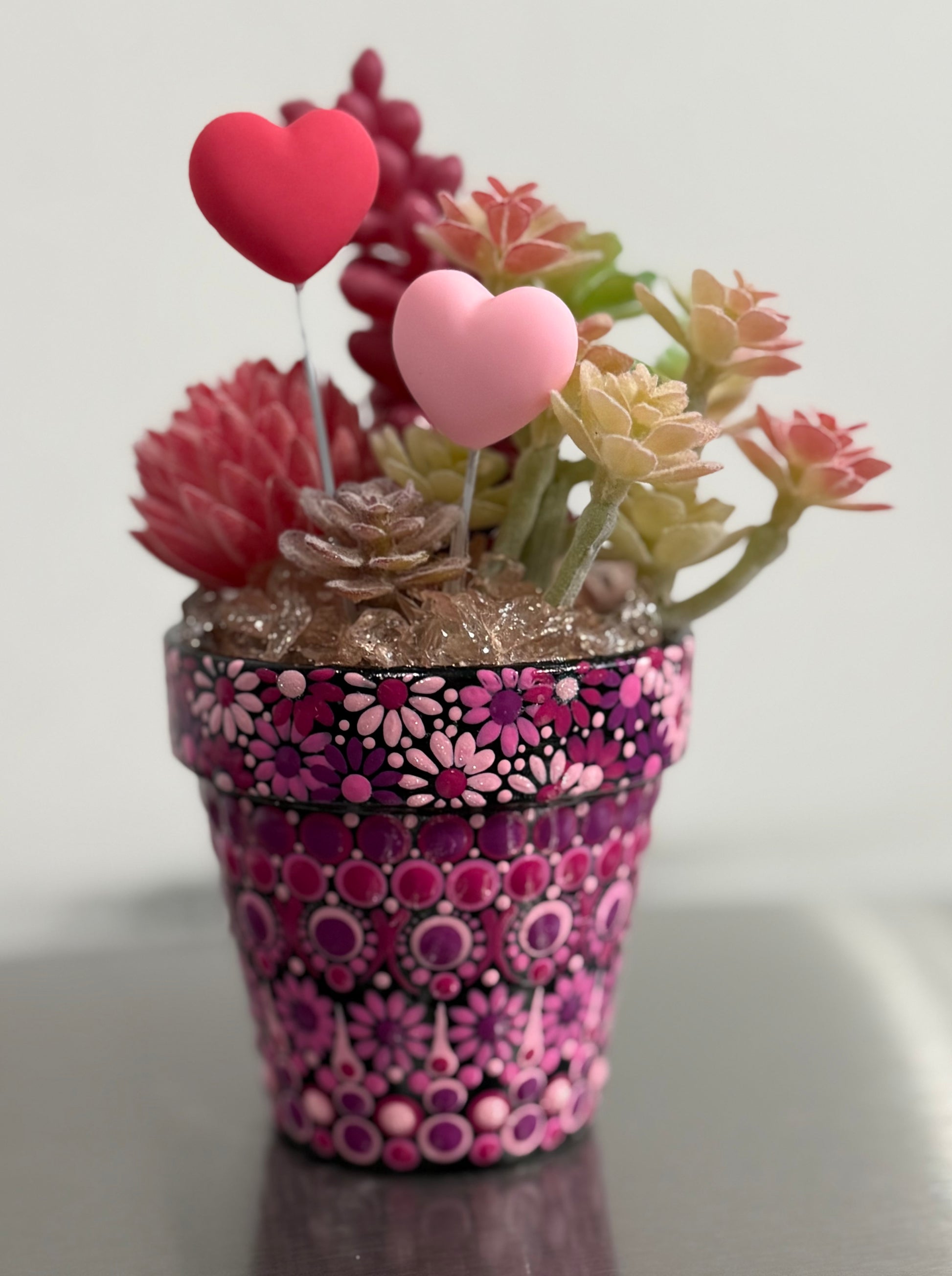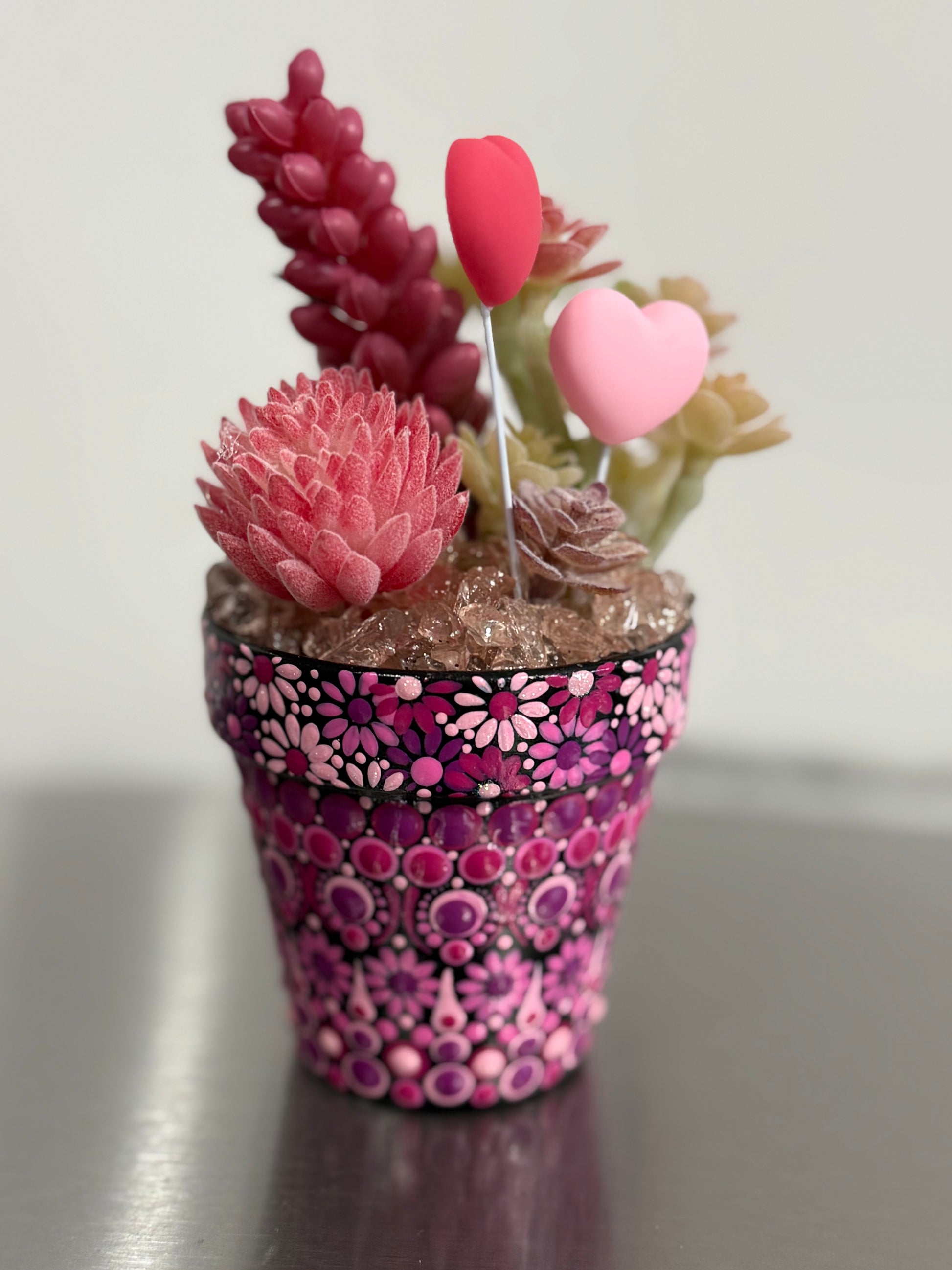Hand-Painted (by me) 2 1/2" terracotta pot with a variety of faux succulents/plants. Each pot is protected by a high-gloss finish and filled with permanent rock, floral decor, and I like to add cute little friends/items to each !
