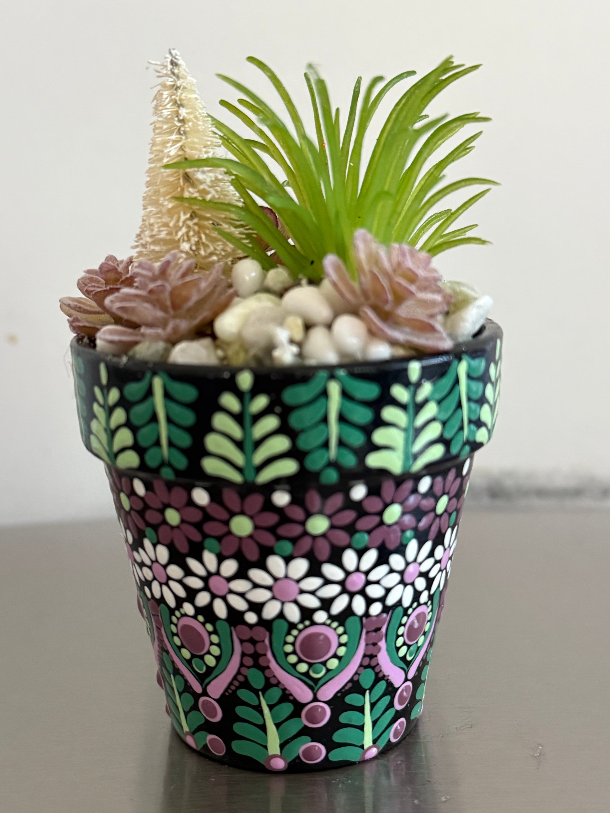 Hand-Painted (by me) 2 1/2" terracotta pot with a variety of faux succulents/plants. Each pot is protected by a high-gloss finish and filled with permanent rock, floral decor, and I like to add cute little friends/items to each !