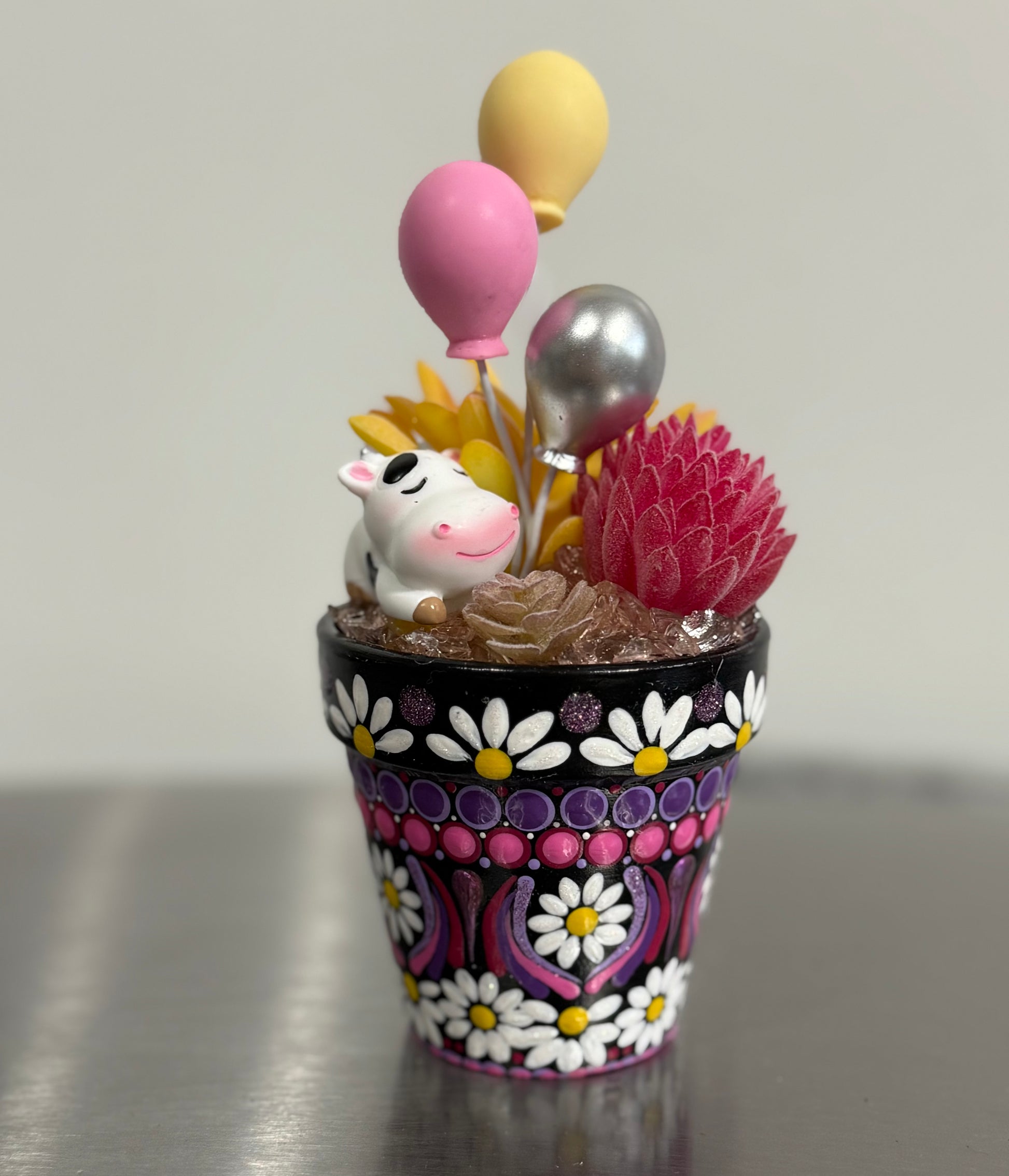 Hand-Painted (by me) 2 1/2" terracotta pot with a variety of faux succulents/plants. Each pot is protected by a high-gloss finish and filled with permanent rock, floral decor, and I like to add cute little friends/items to each !