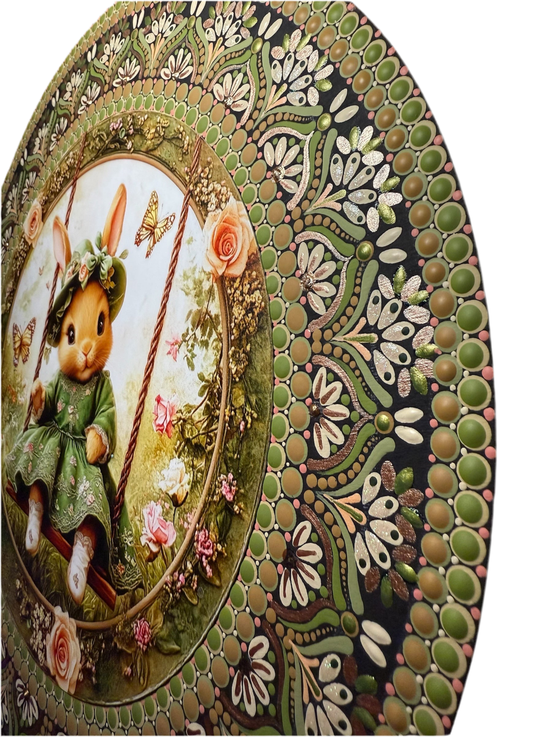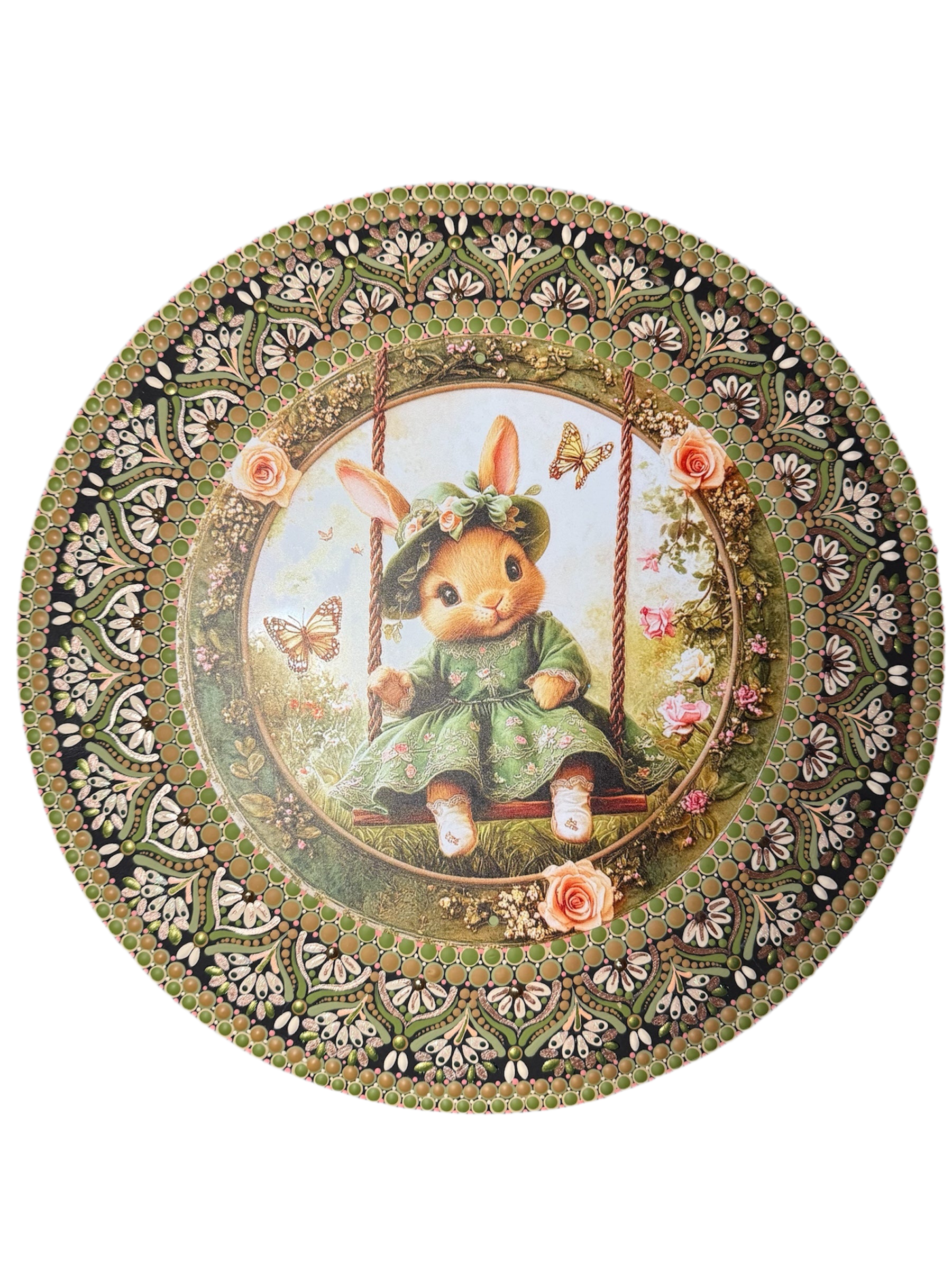 Centerpiece is an 8” metal pre-printed insert with surrounding hand-painted art by me ! Clear gloss coated to protect and add a shine. Total diameter: 12”