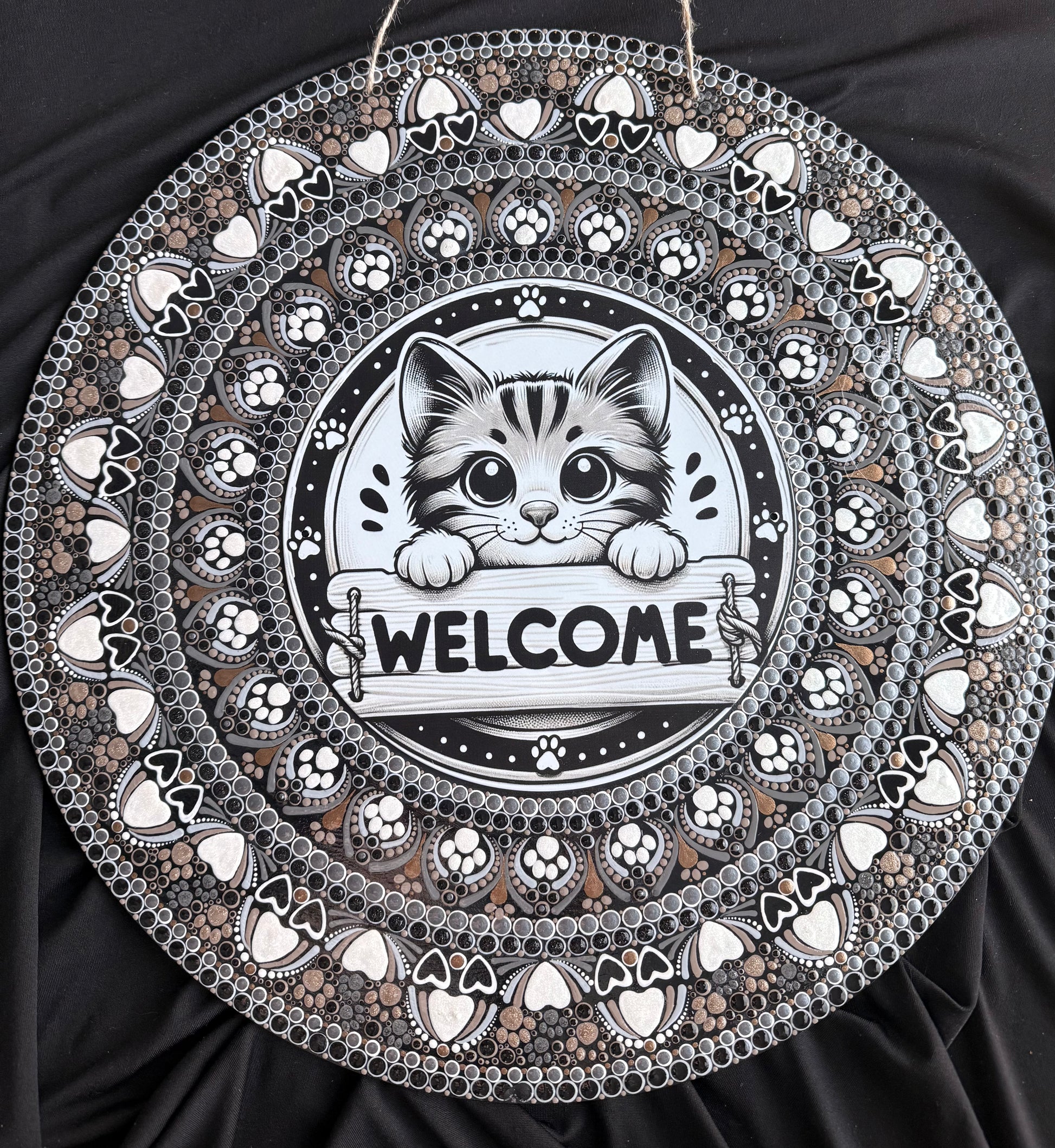 Hand Painted 16” wood round, with metal insert. Adorable welcome sign makes a wonderful gift or a cute addition to your entry ! Sealed with gloss that adds protection and shine.