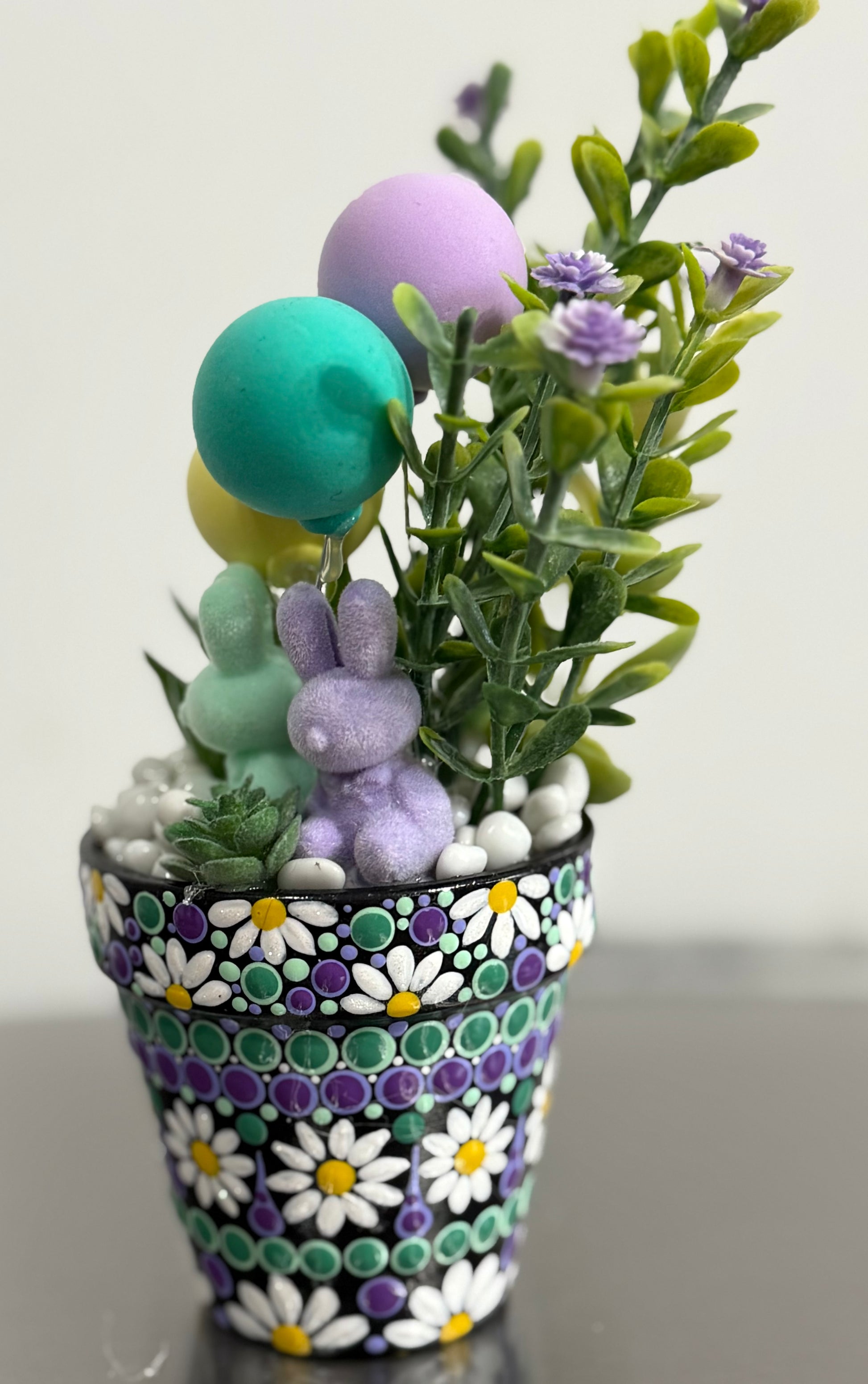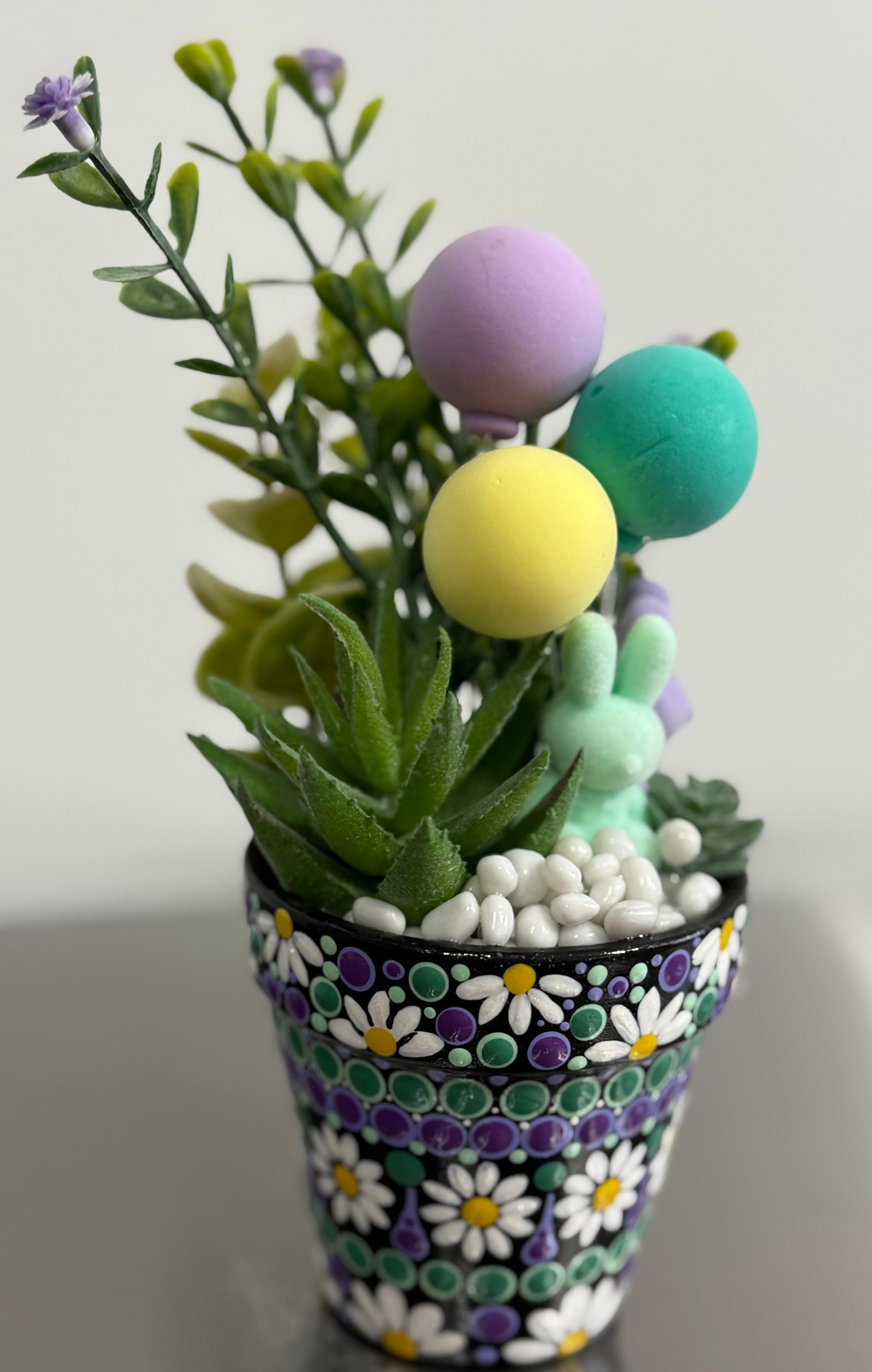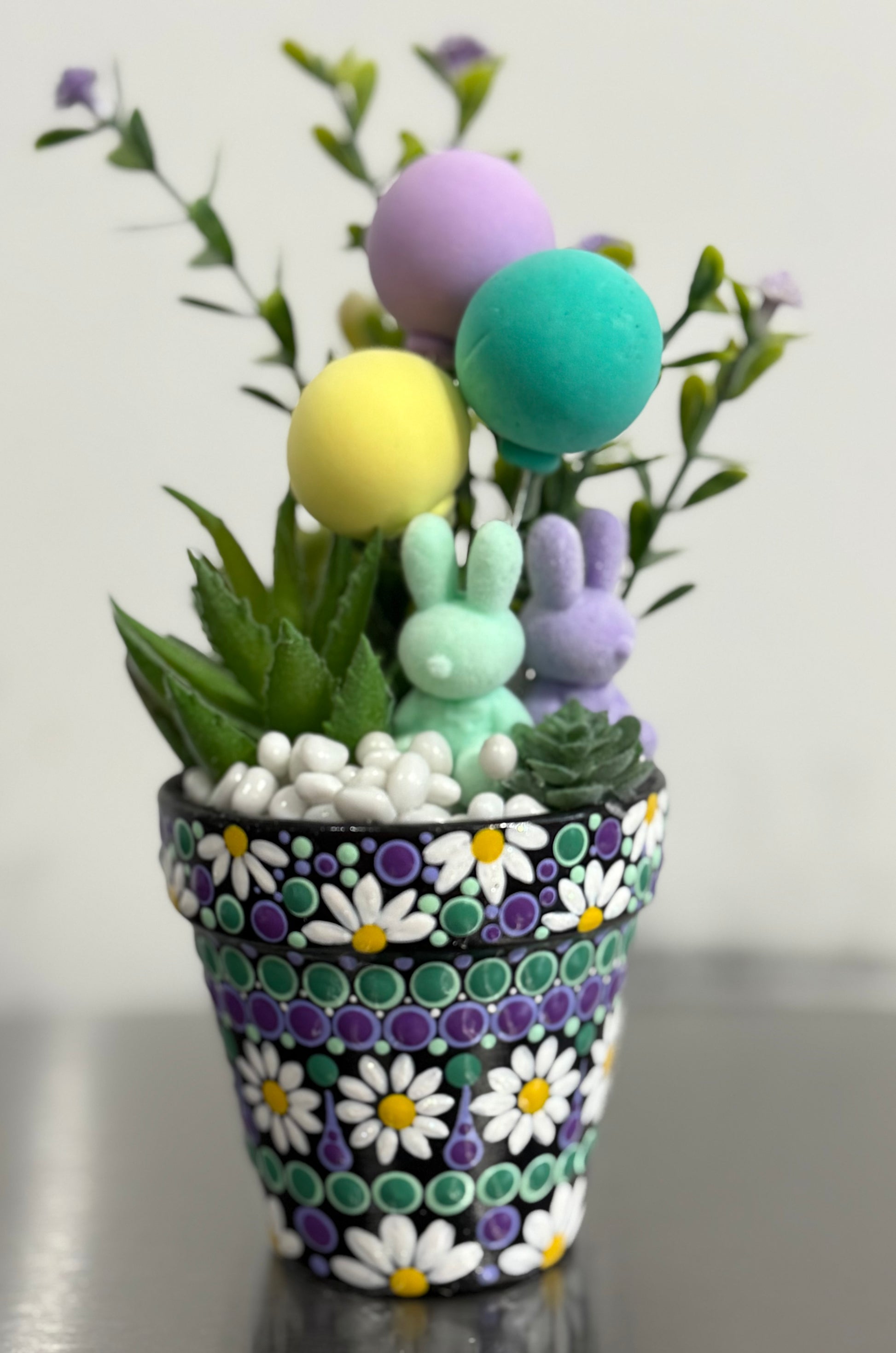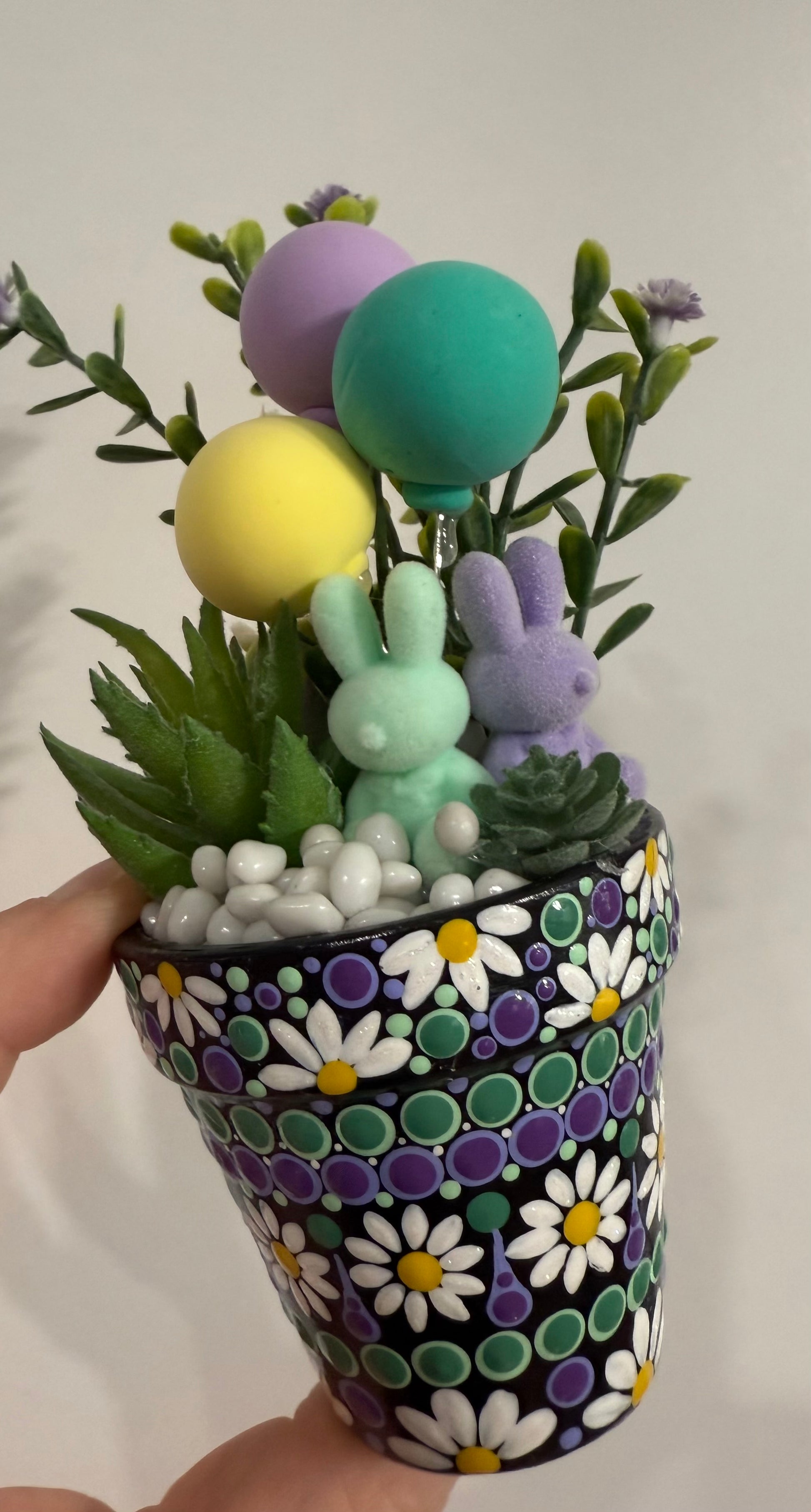 Hand-Painted (by me) 2 1/2" terracotta pot with a variety of faux succulents/plants. Each pot is protected by a high-gloss finish and filled with permanent rock, floral decor, and I like to add cute little friends/items to each !