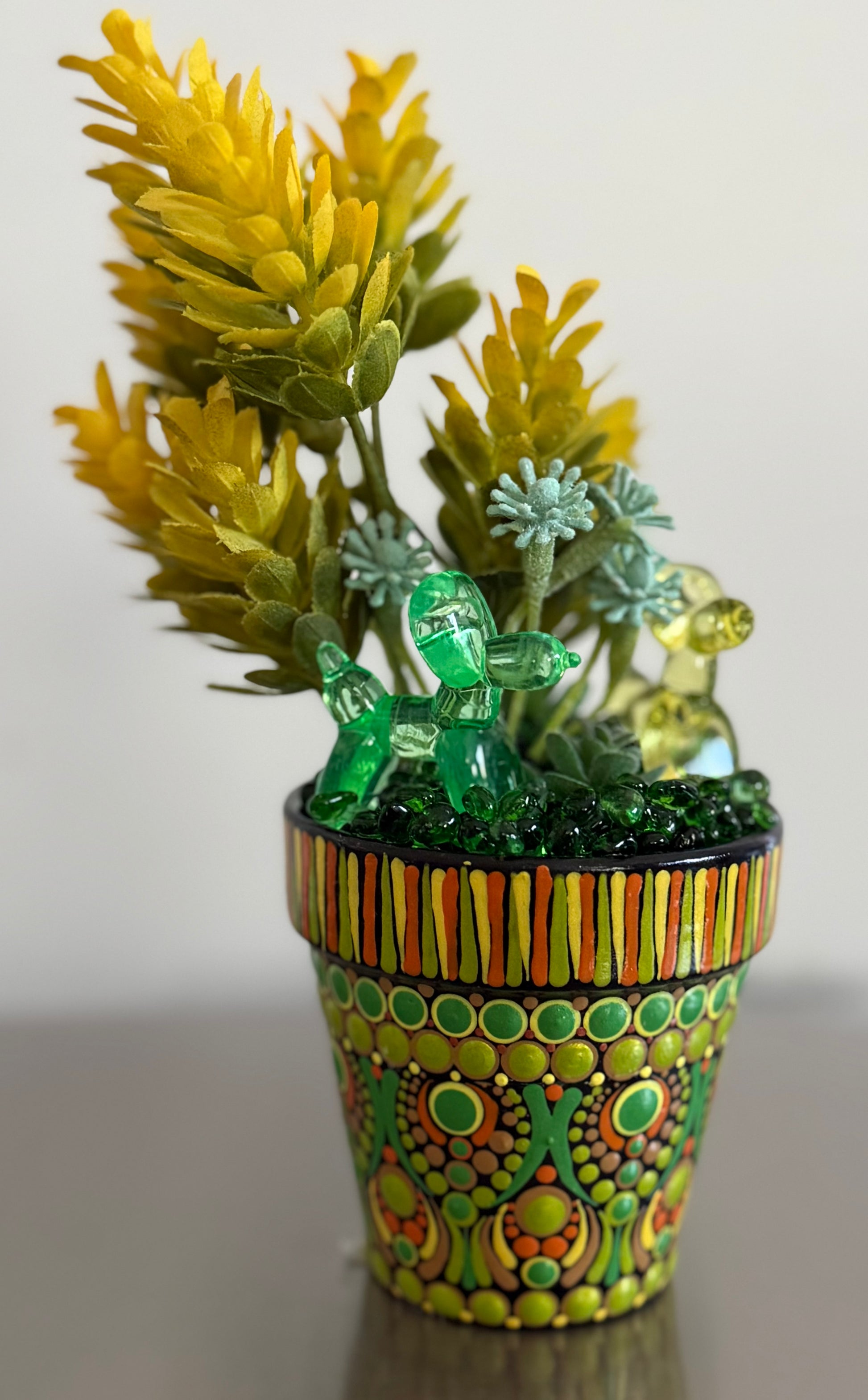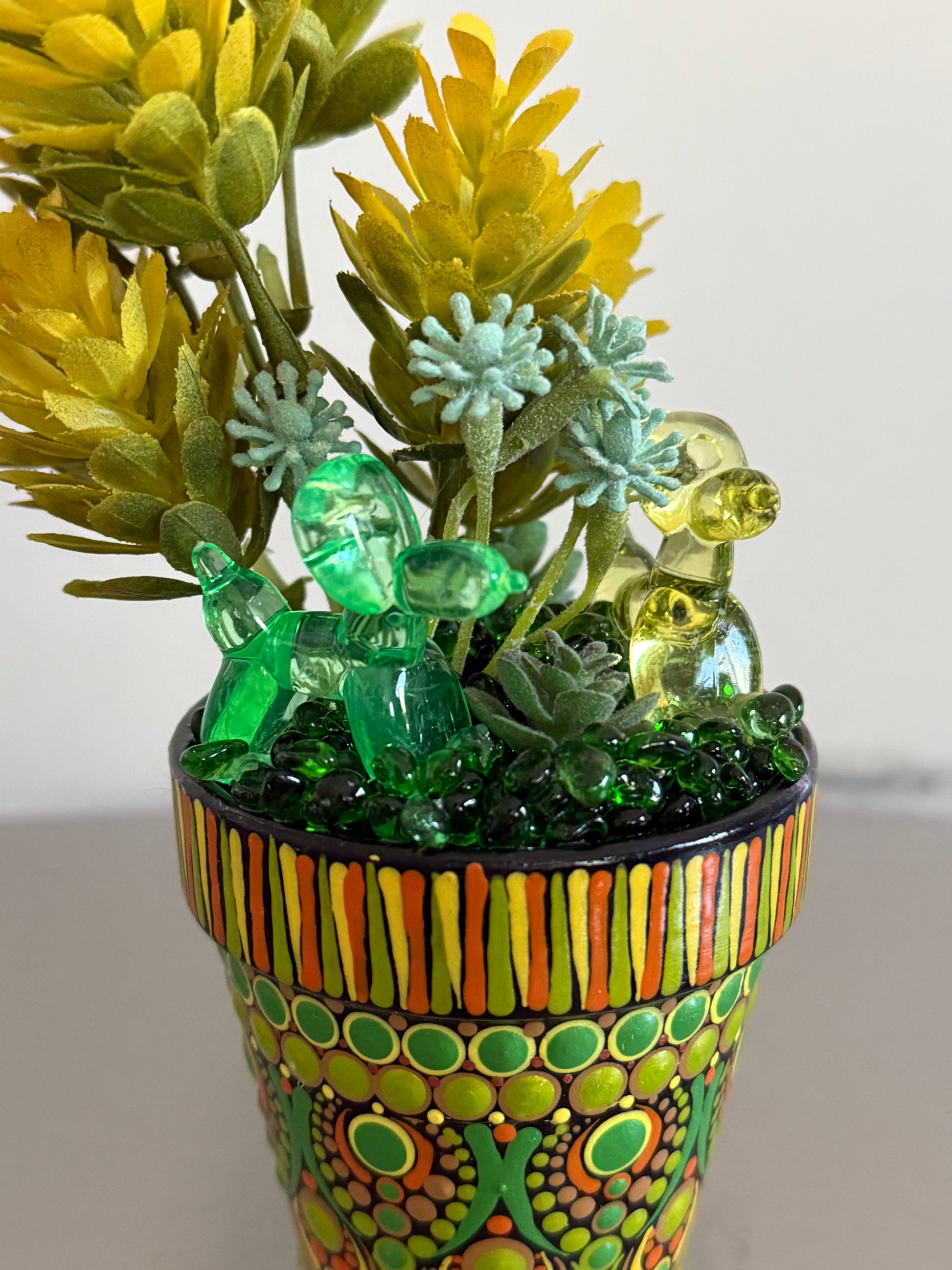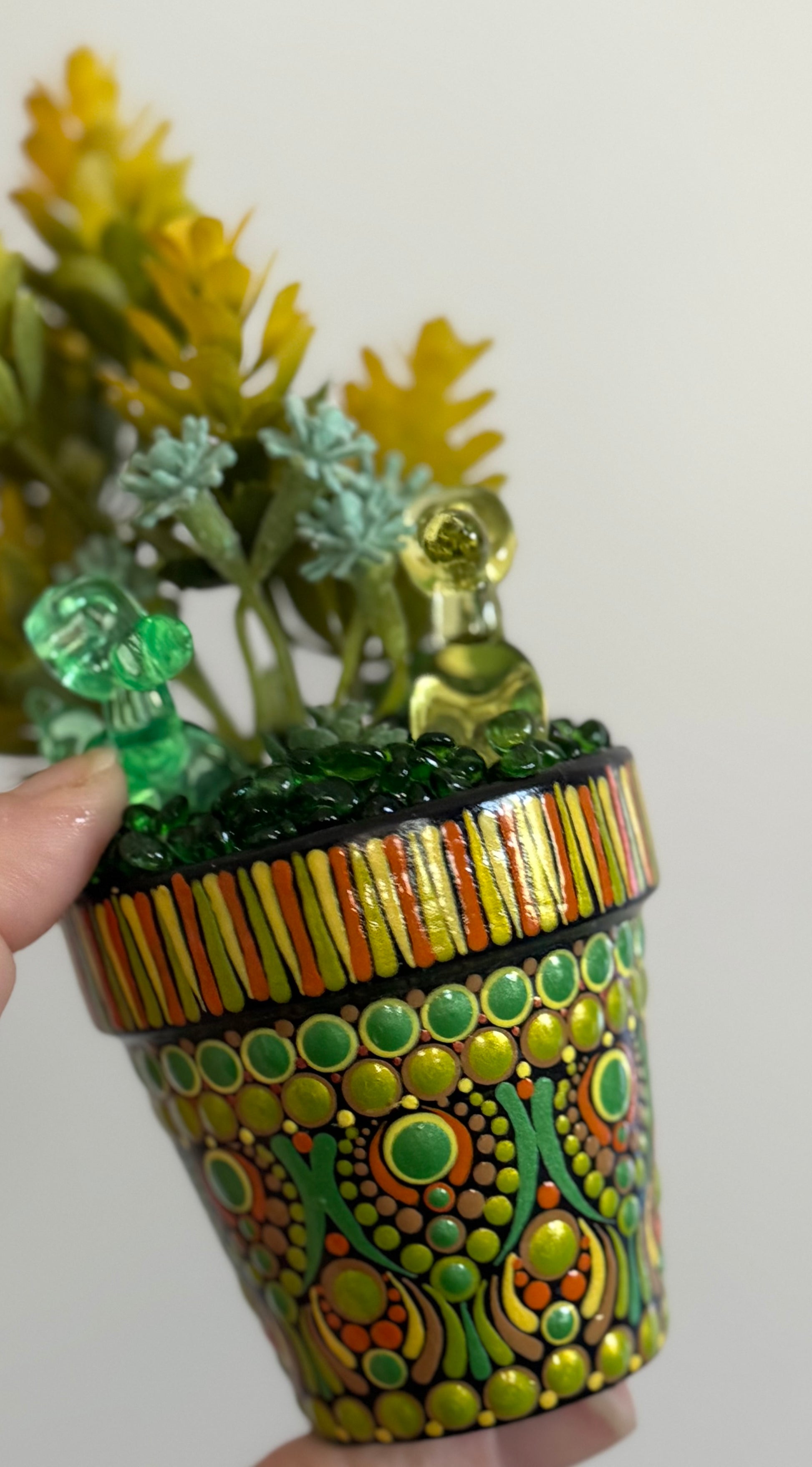 Hand-Painted (by me) 2 1/2" terracotta pot with a variety of faux succulents/plants. Each pot is protected by a high-gloss finish and filled with permanent rock, floral decor, and I like to add cute little friends/items to each !
