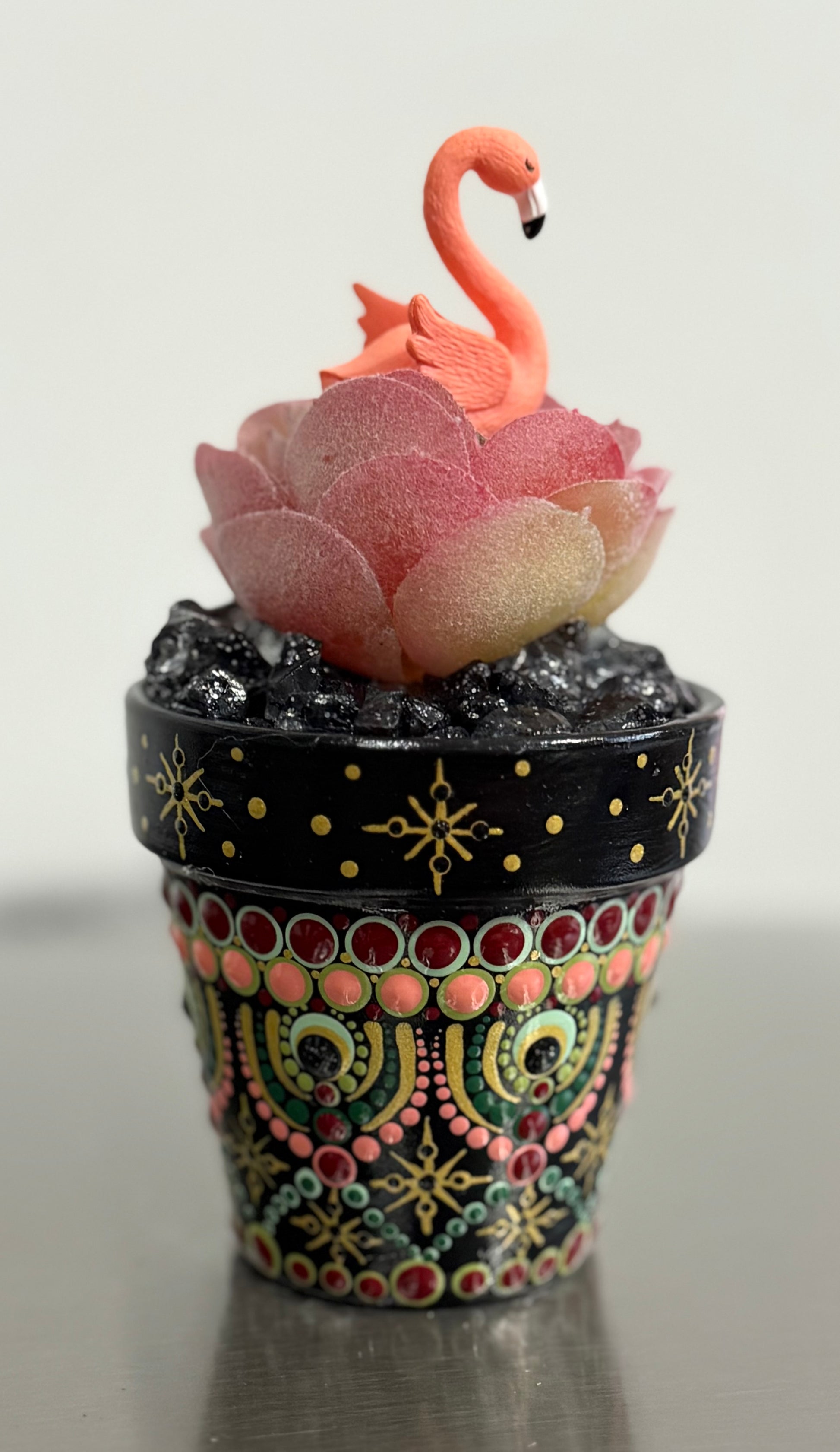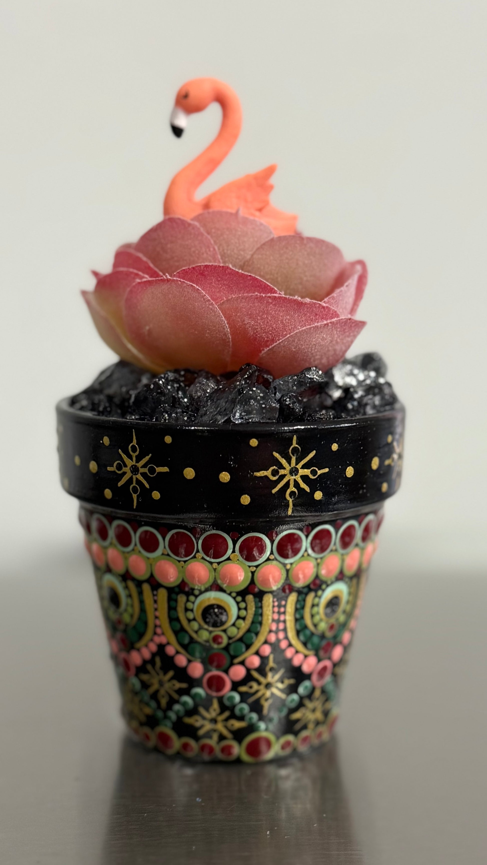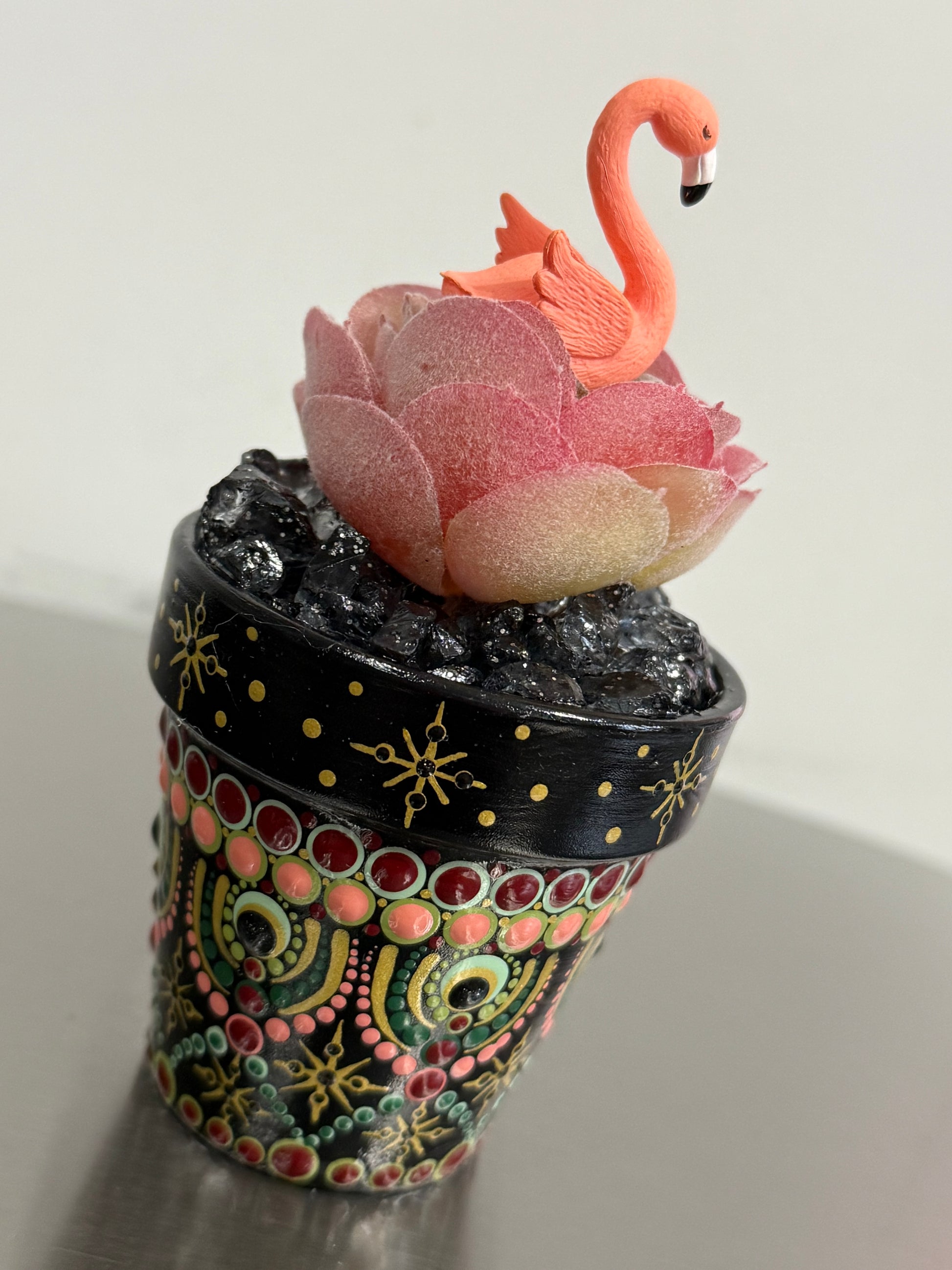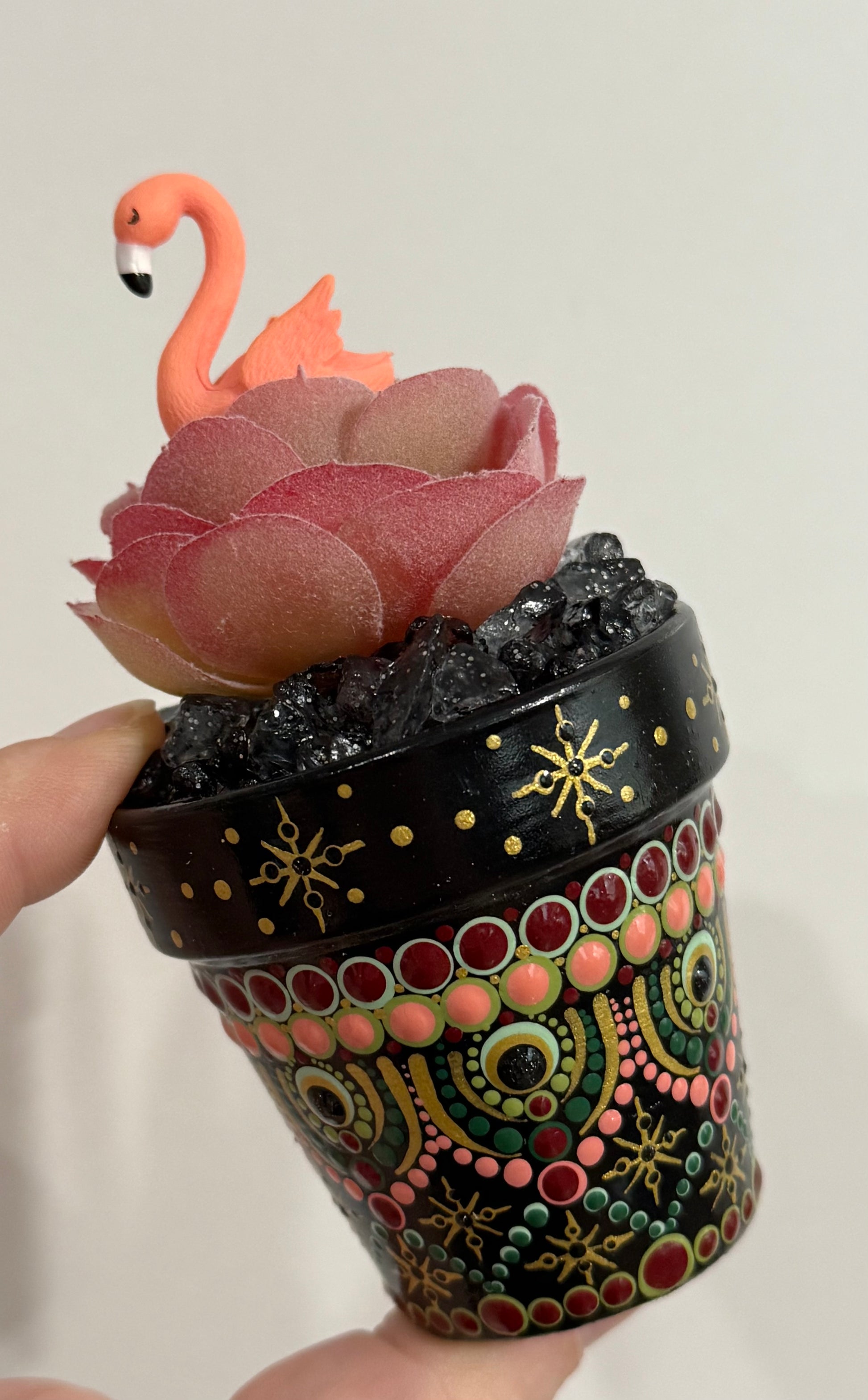Hand-Painted (by me) 2 1/2" terracotta pot with a variety of faux succulents/plants. Each pot is protected by a high-gloss finish and filled with permanent rock, floral decor, and I like to add cute little friends/items to each !