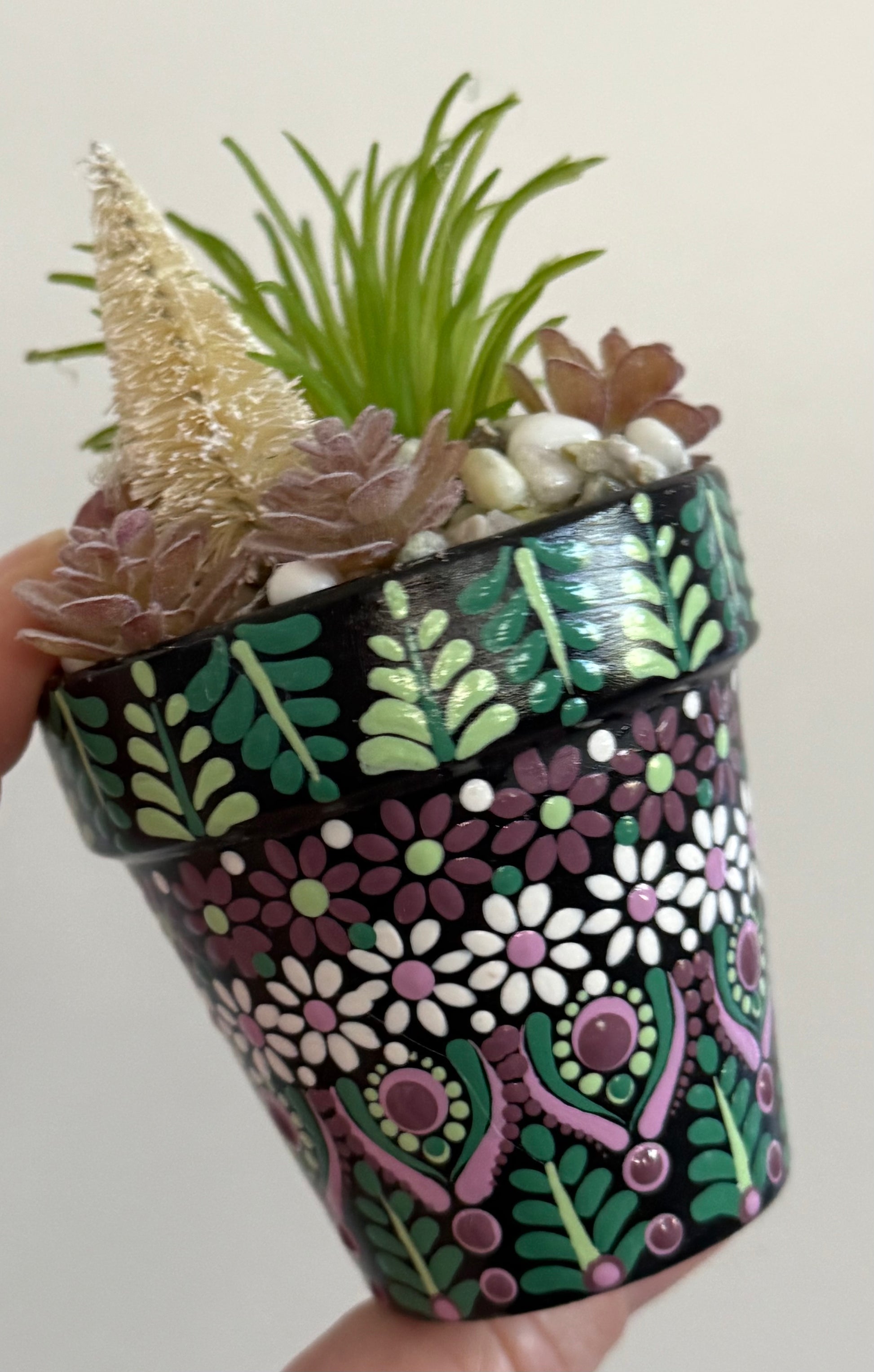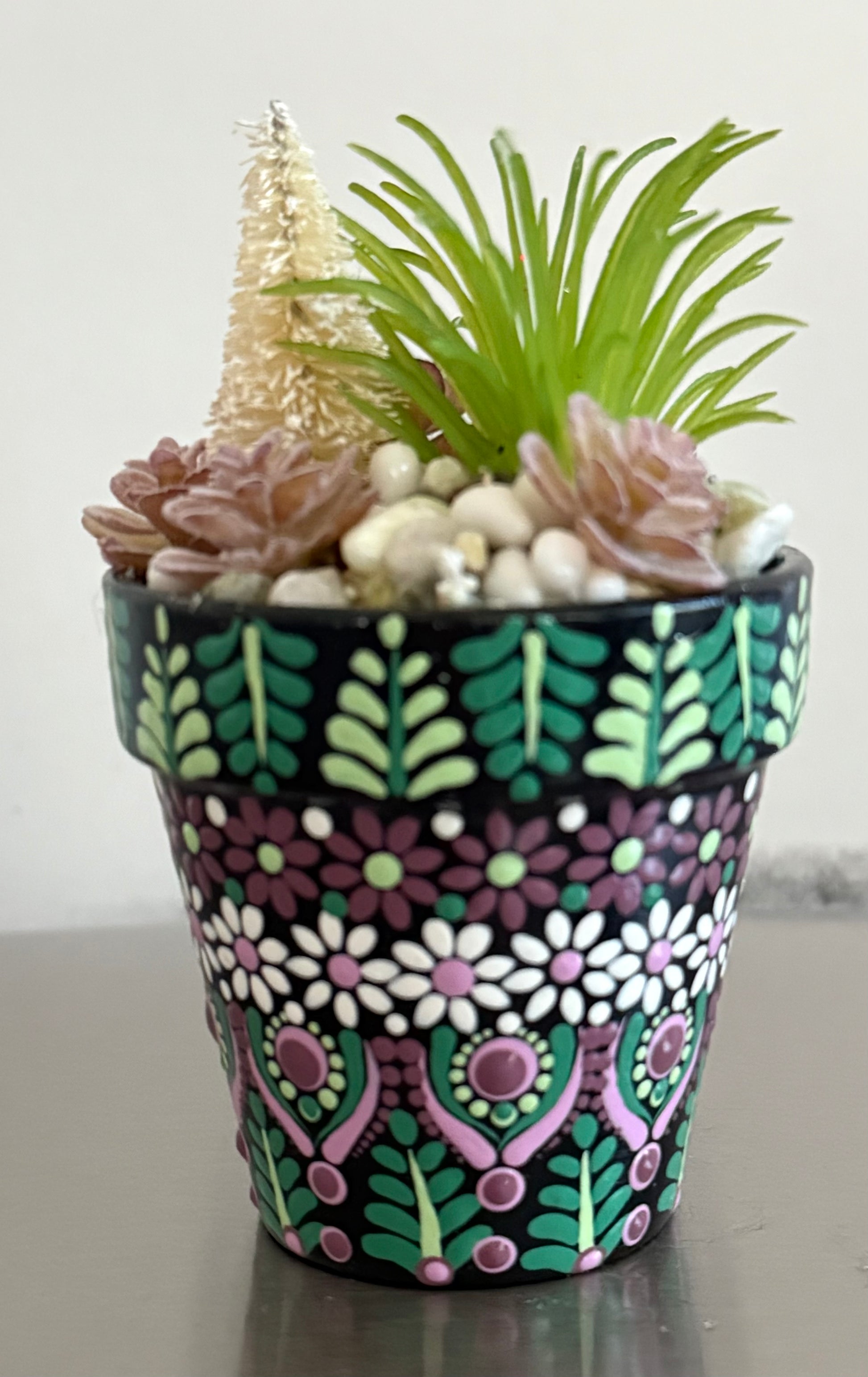 Hand-Painted (by me) 2 1/2" terracotta pot with a variety of faux succulents/plants. Each pot is protected by a high-gloss finish and filled with permanent rock, floral decor, and I like to add cute little friends/items to each !