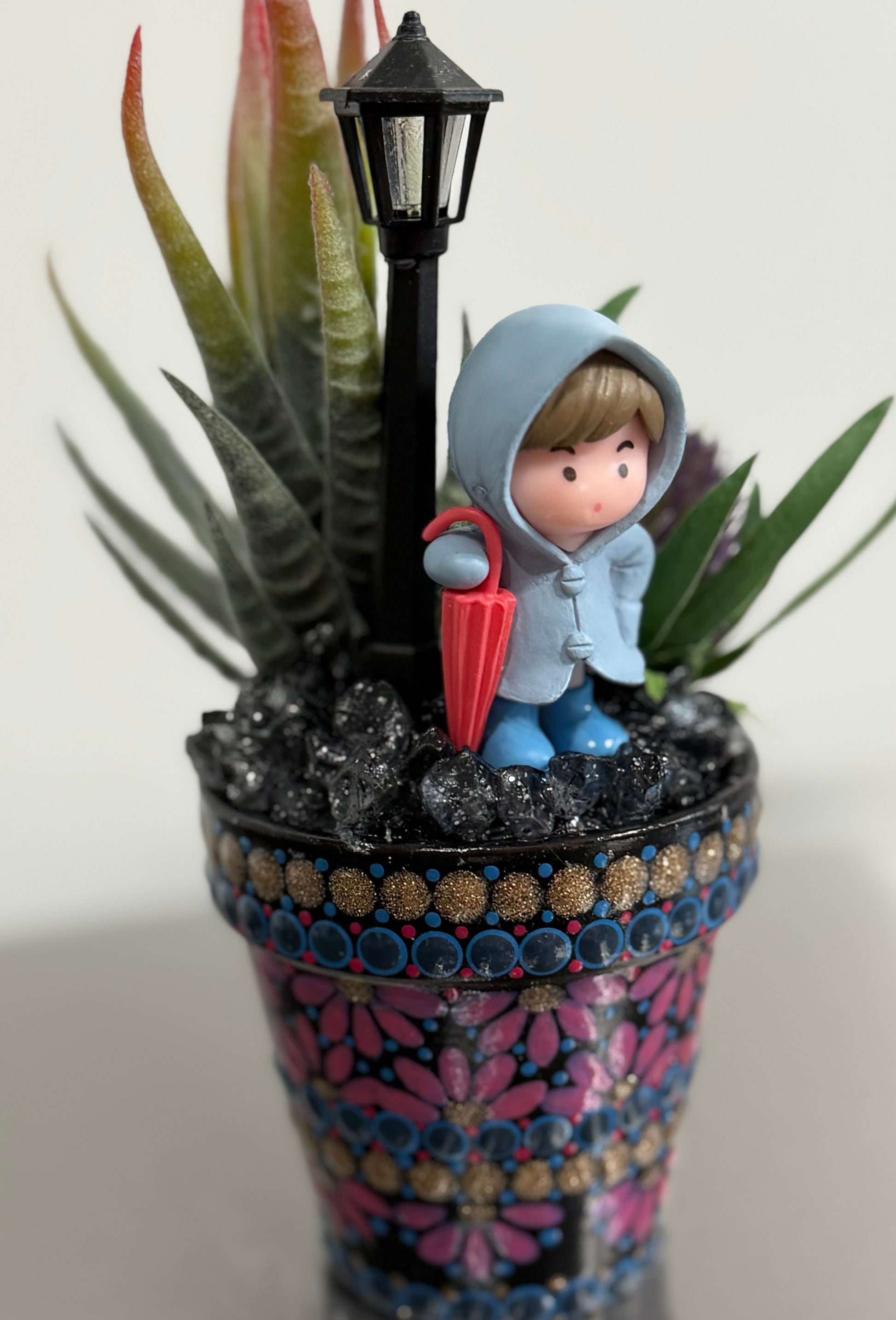 Hand-Painted (by me) 2 1/2" terracotta pot with a variety of faux succulents/plants. Each pot is protected by a high-gloss finish and filled with permanent rock, floral decor, and I like to add cute little friends/items to each !