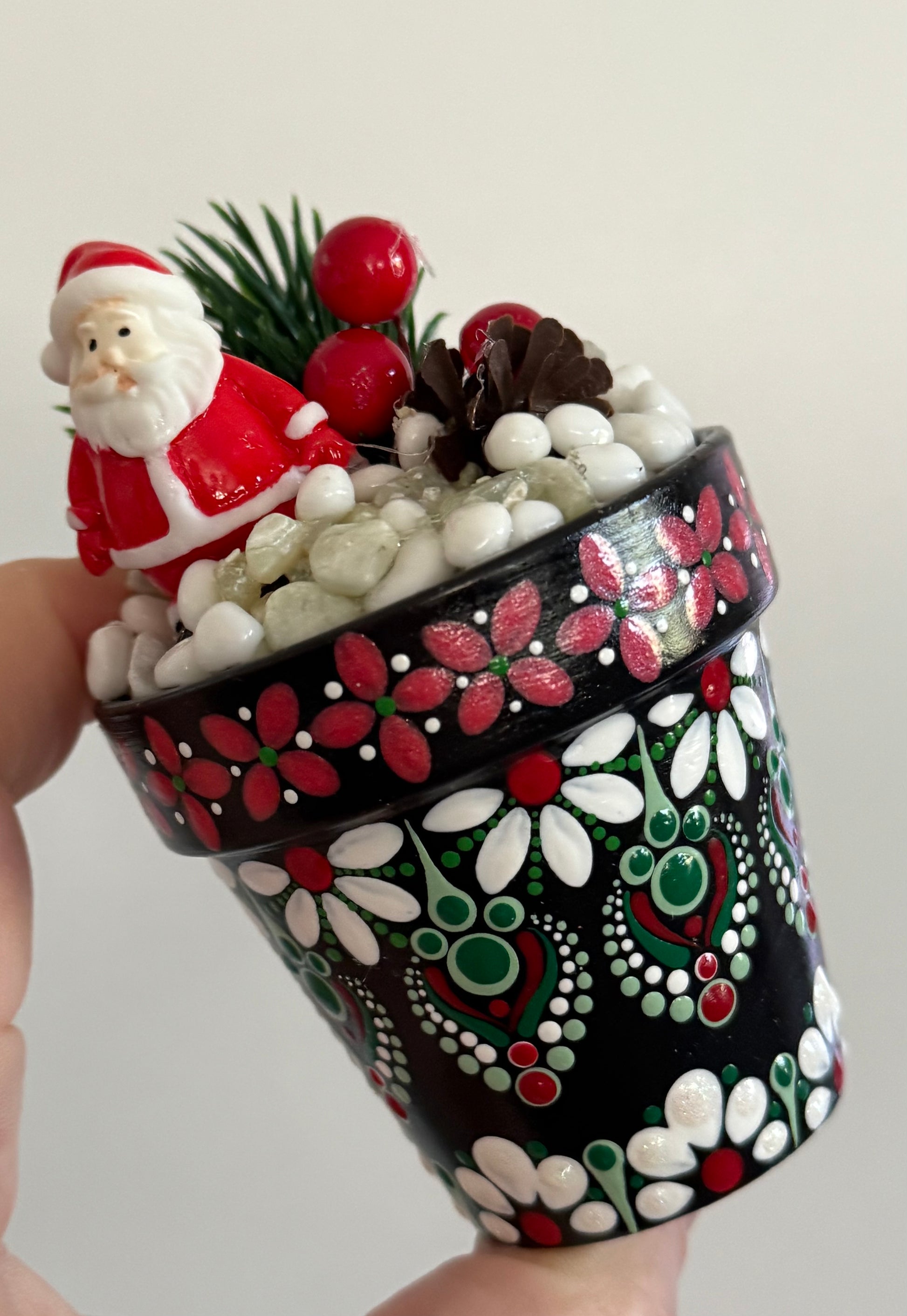 Hand-Painted (by me) 2 1/2" terracotta pot with a variety of faux succulents/plants. Each pot is protected by a high-gloss finish and filled with permanent rock, floral decor, and I like to add cute little friends/items to each !