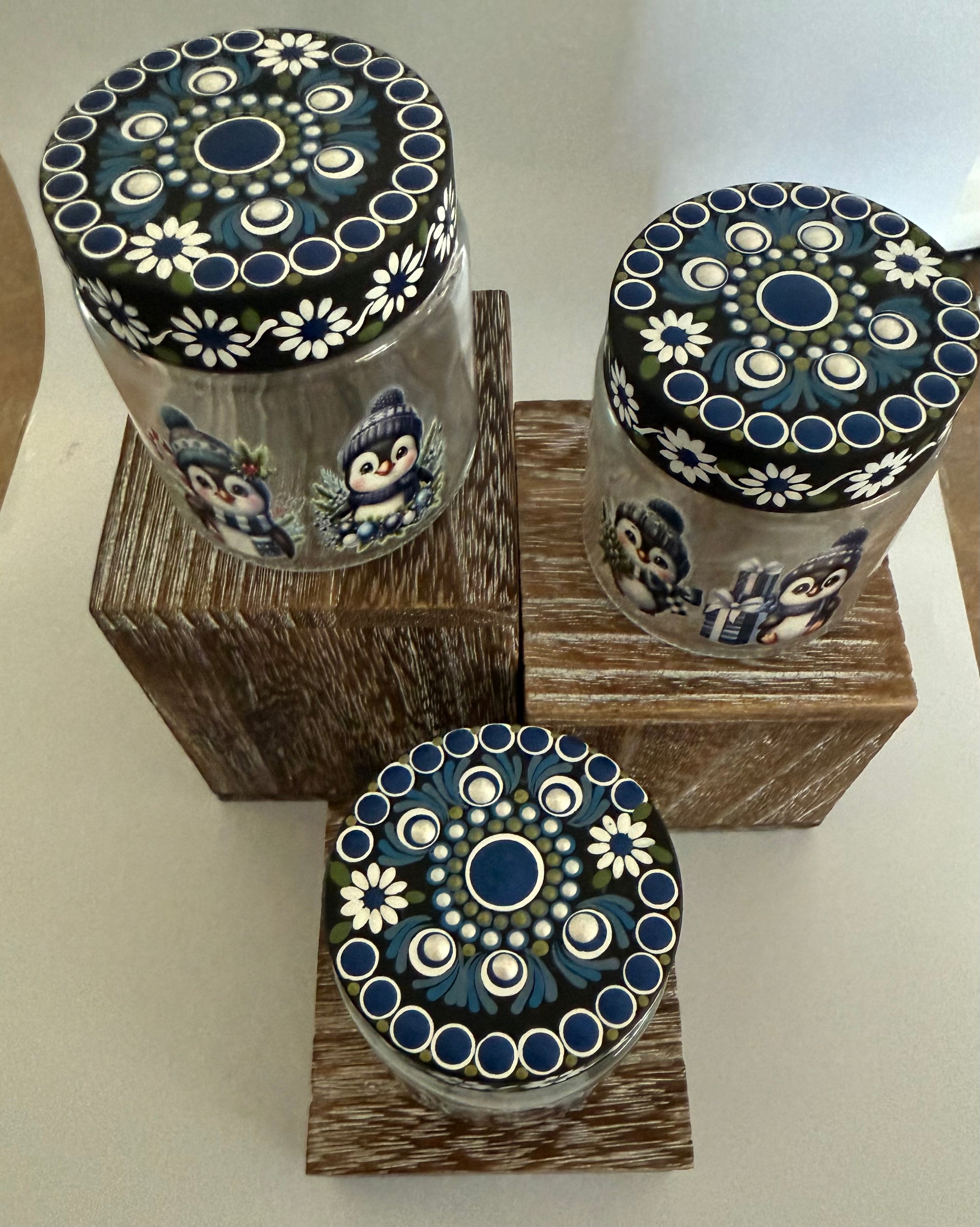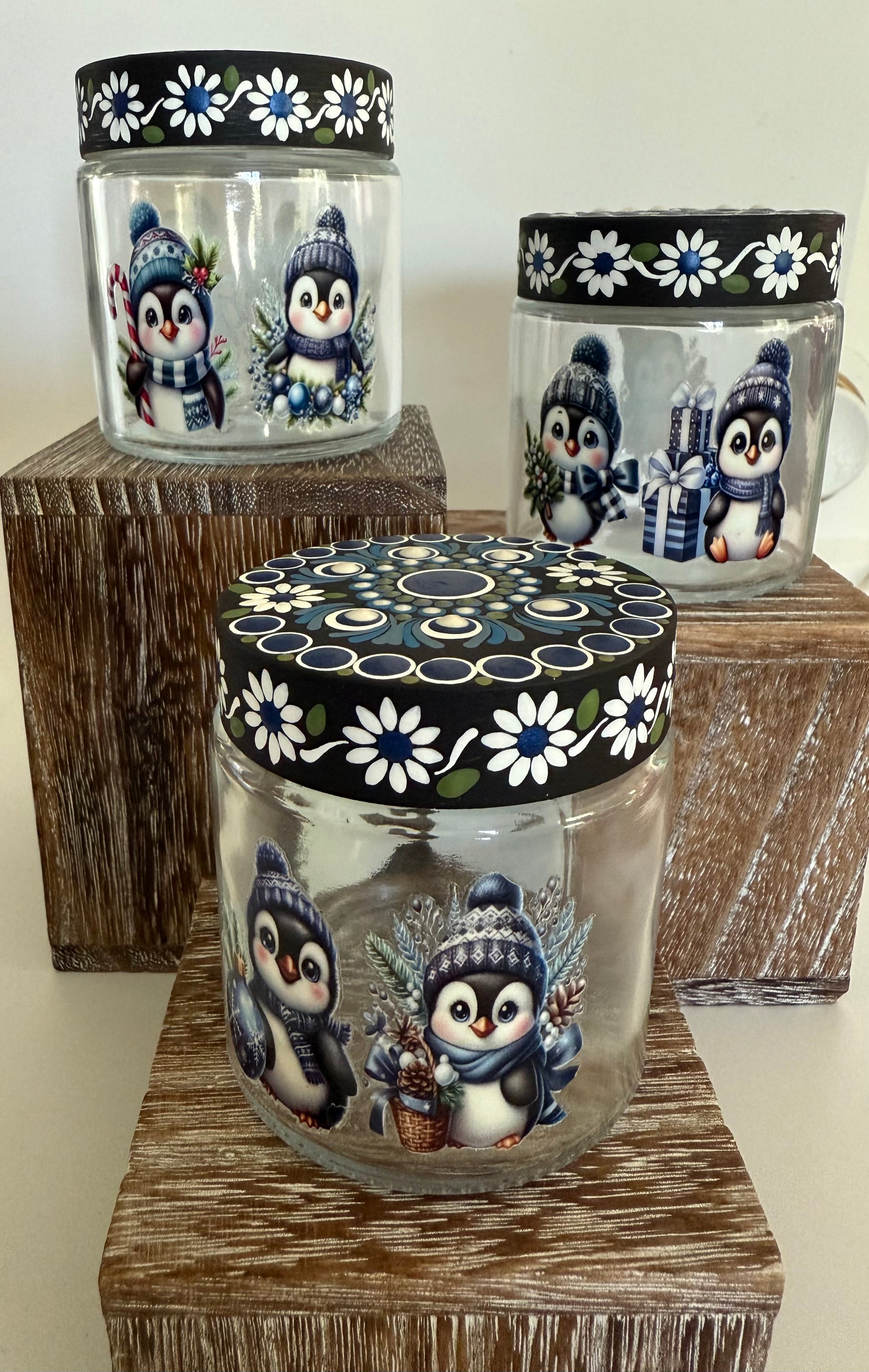 These are adorable 4oz glass jars with hand painted, twist on lids, adorned with cute penguin decals. All hand painted items are clear coated to protect the art and adds a nice glossy shine. (This order includes all 3 jars pictured)