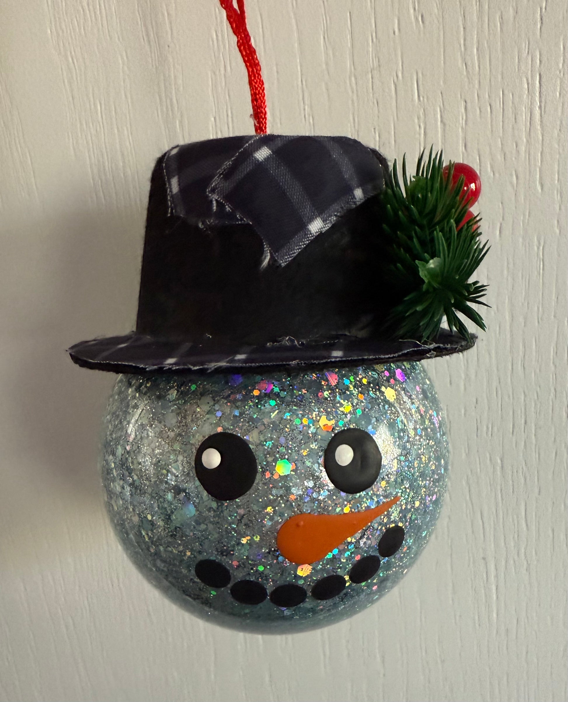3” glittered plastic Ornament / 4” total with hat - Hand painted, adorable jingle bell snowman, Ice Blue Iridescent glitter, plaid patched hat. (Bell concealed under felt hat)