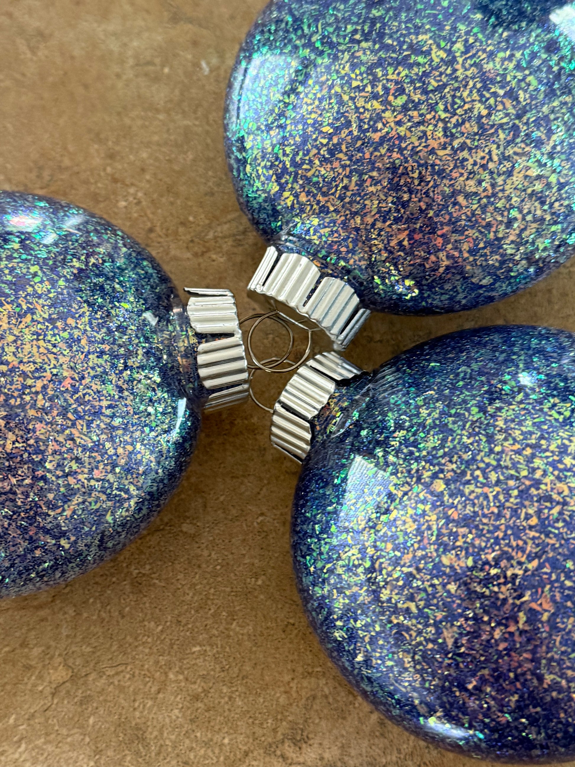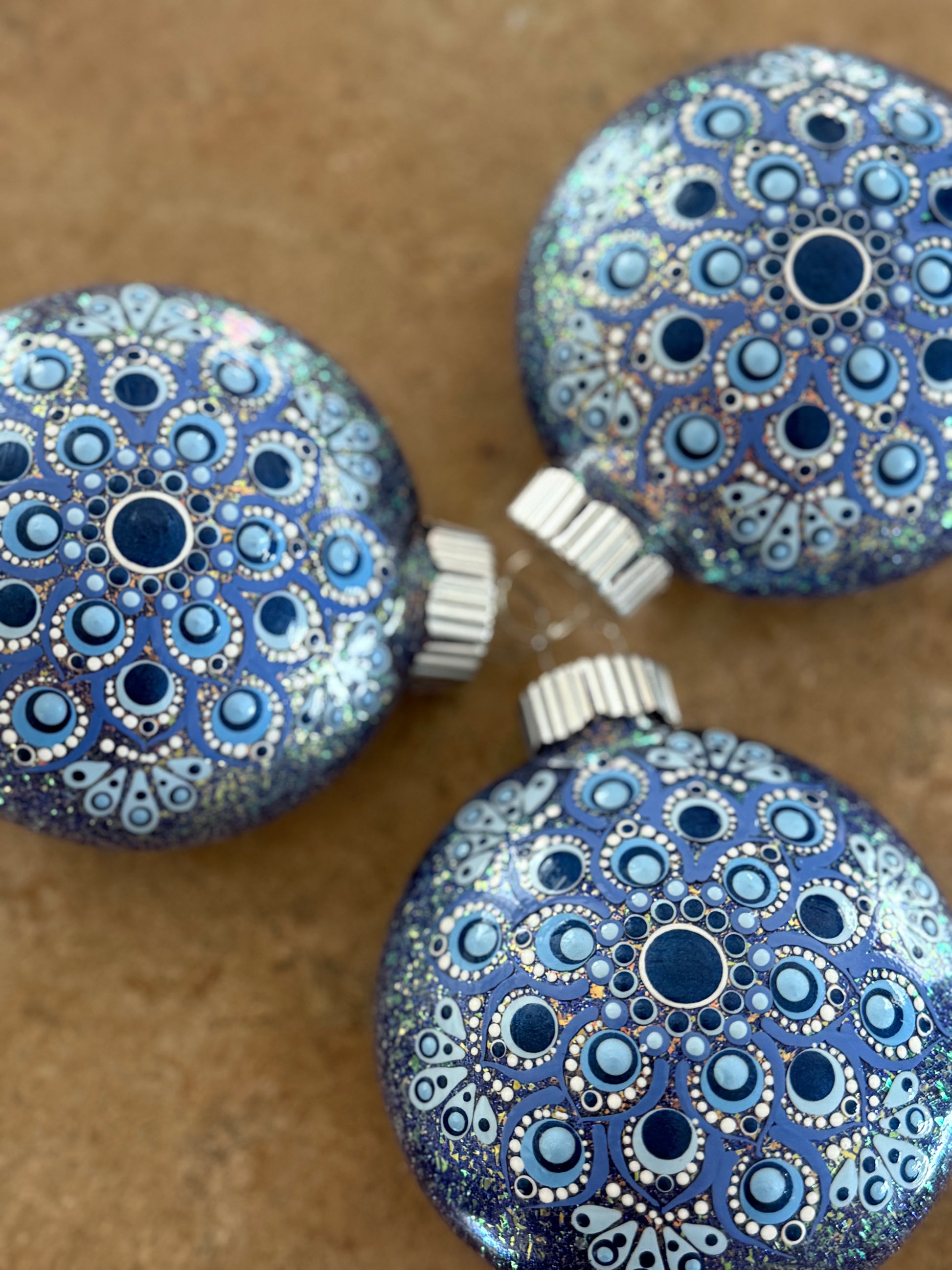 This is a set of three ornaments, each beautifully glittered and hand painted. Disc Ornament is 3.14”, made of plastic for great durability, and finished with a protective gloss.