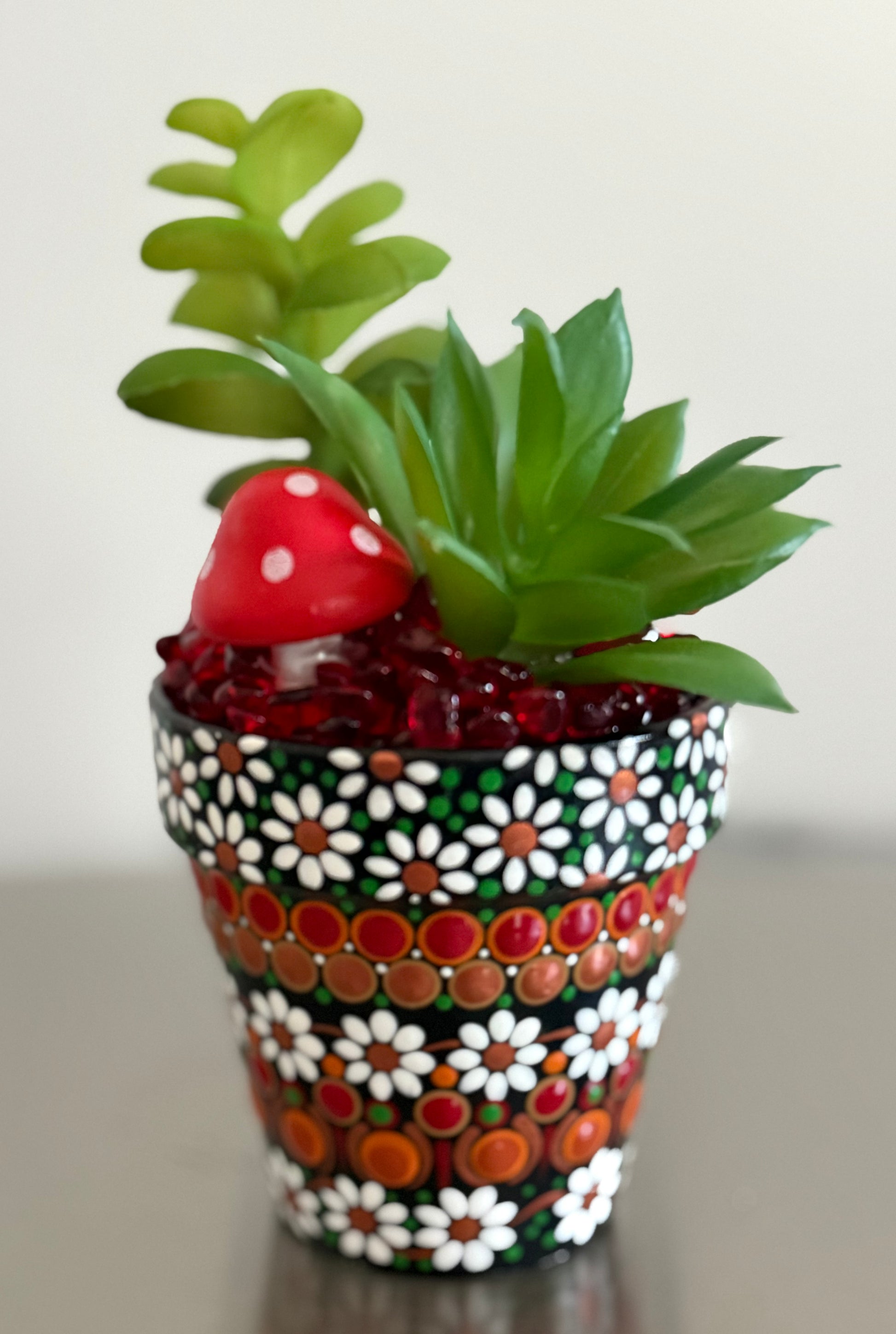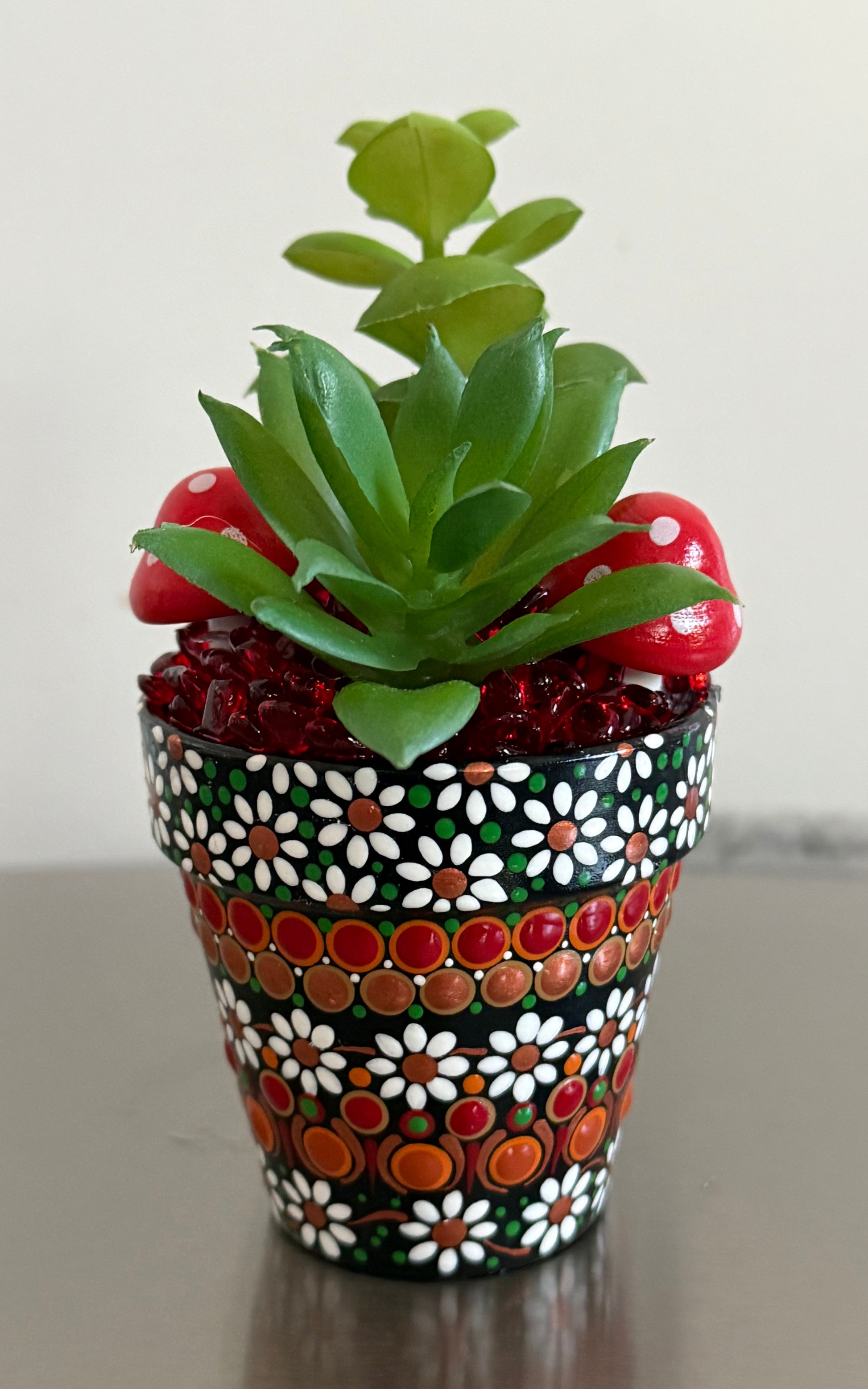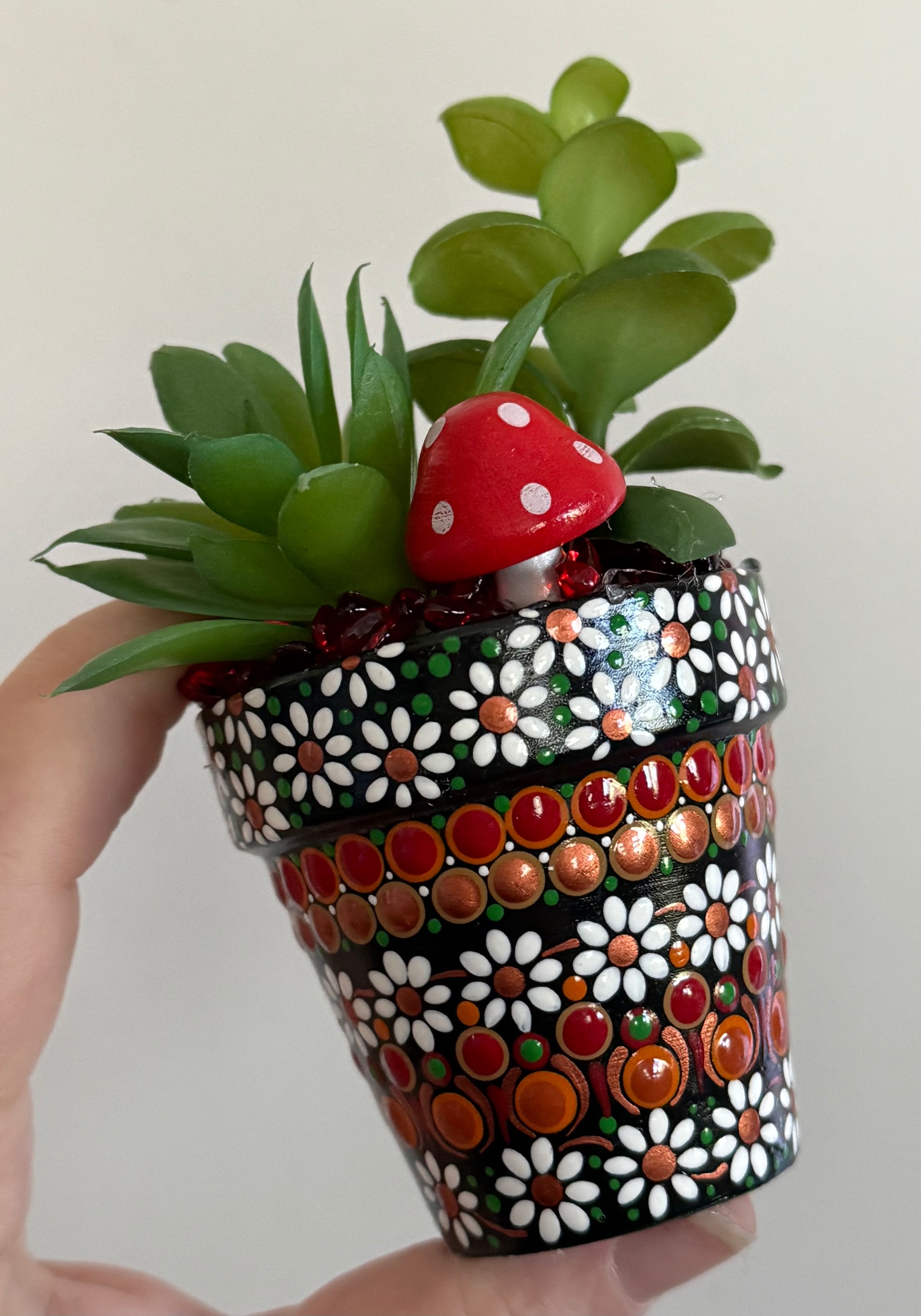 Hand-Painted (by me) 2 1/2" terracotta pot with a variety of faux succulents/plants. Each pot is protected by a high-gloss finish and filled with permanent rock, floral decor, and I like to add cute little friends/items to each !